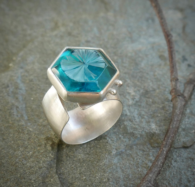Wrapped in Fine Silver and set upon a wide and slightly domed Sterling Silver split band. Fine Silver Detailing on the ring face edge.