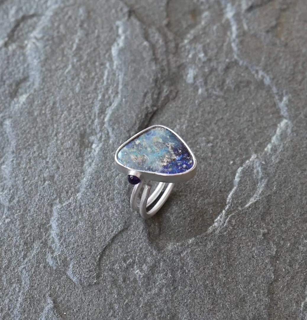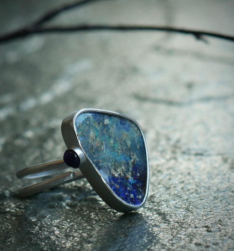 Emergence — An Australian Boulder Opal and Amethyst Ring in Sterling Silver — Size 8 3/4 to 9
