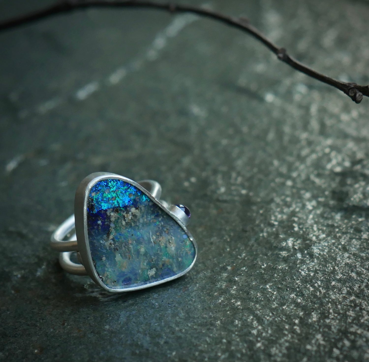 From the iridescent Boulder Opal, to the side flair of Amethyst, the sterling silver open-ended wrapping band that offers some sizing flexibility.