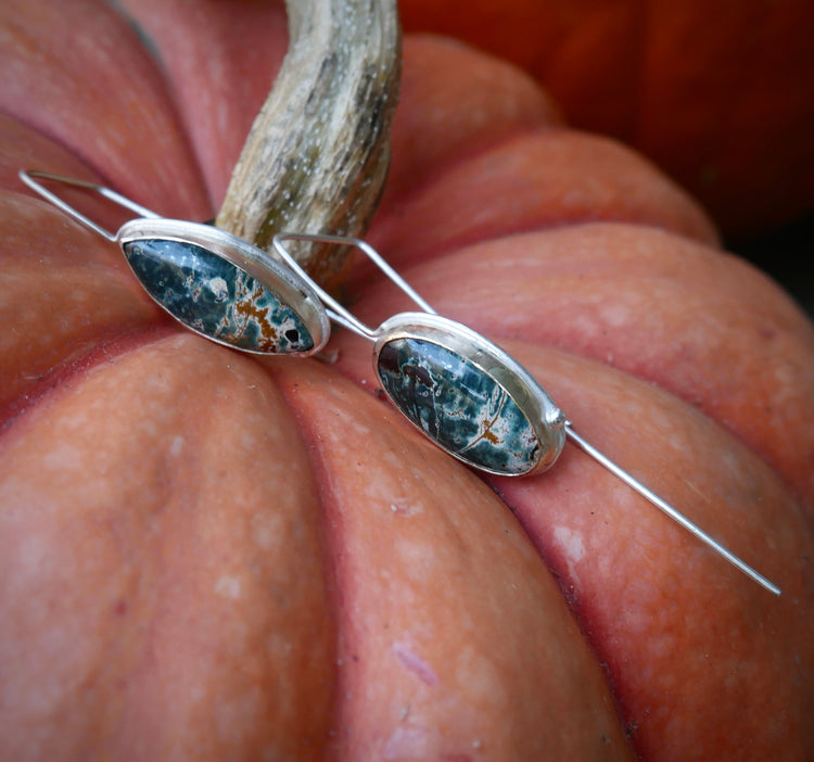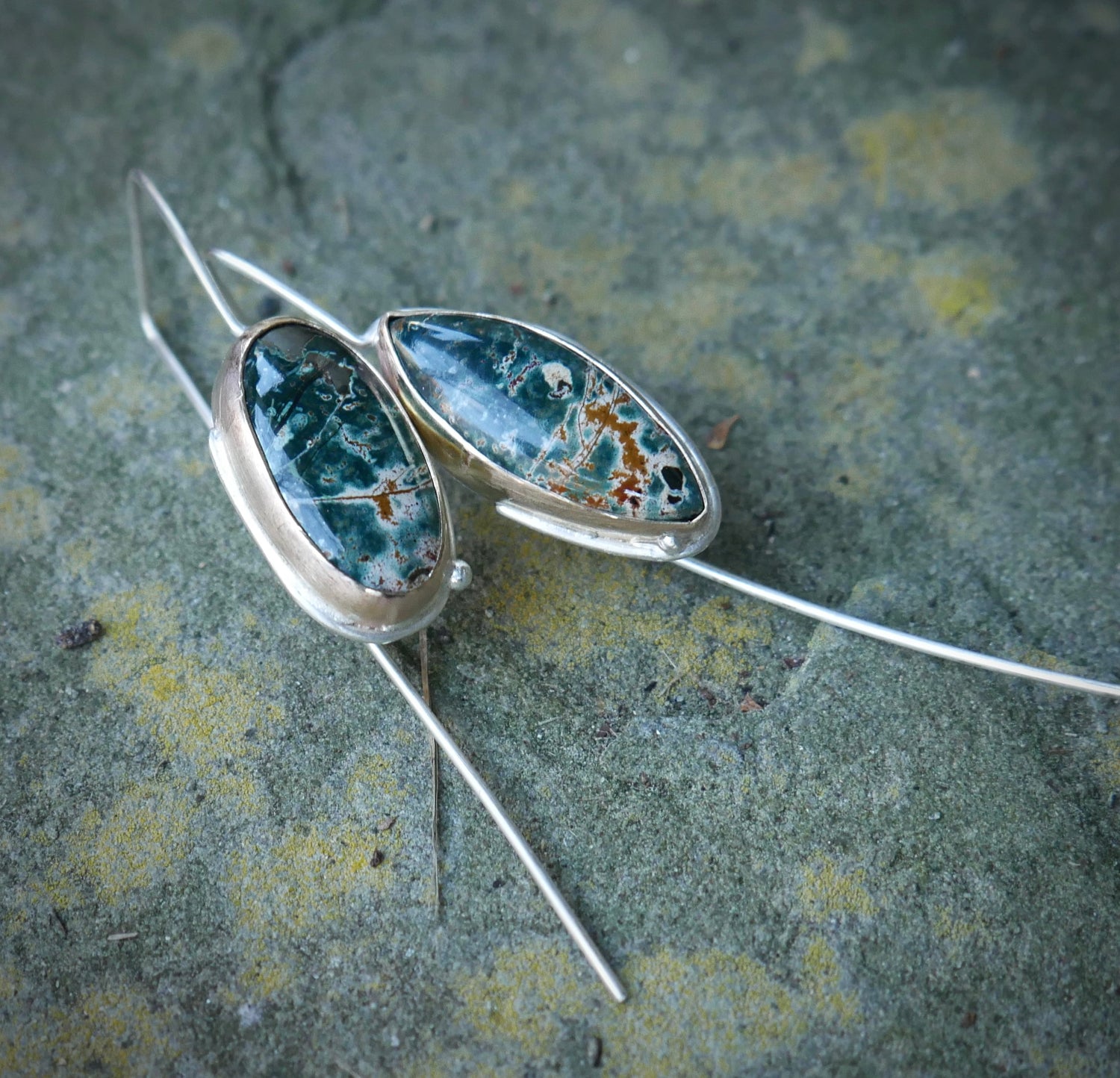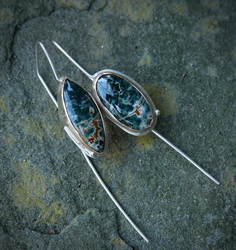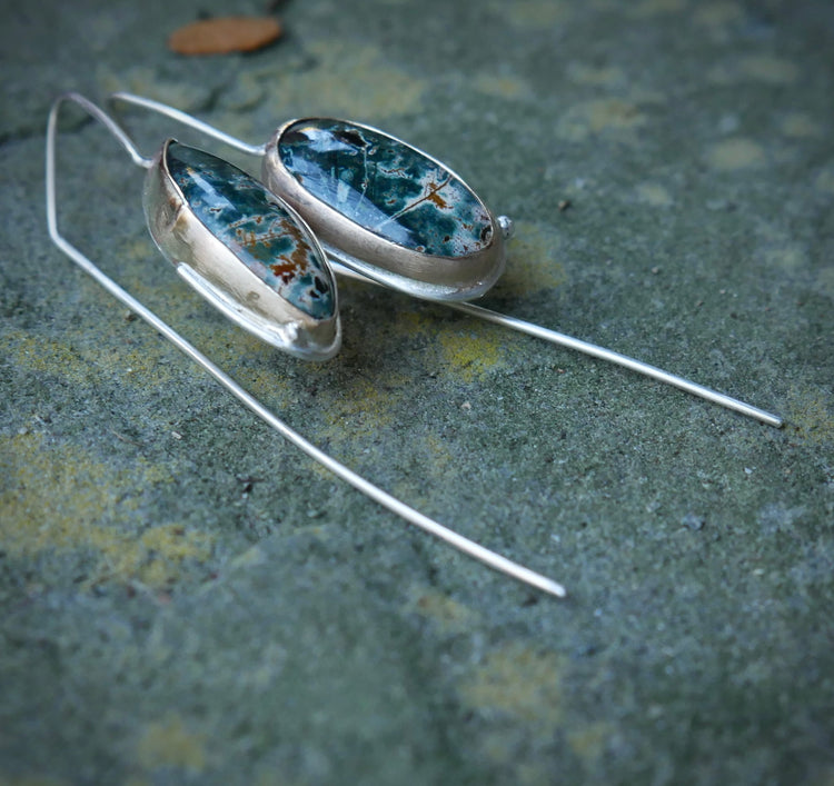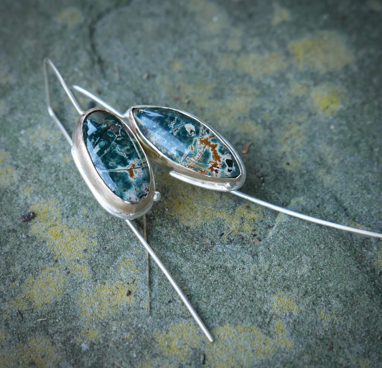 Forest Edge — A Pair of Mismatched Morning Dew Jasper Drop Earrings in Sterling Silver and Gold
