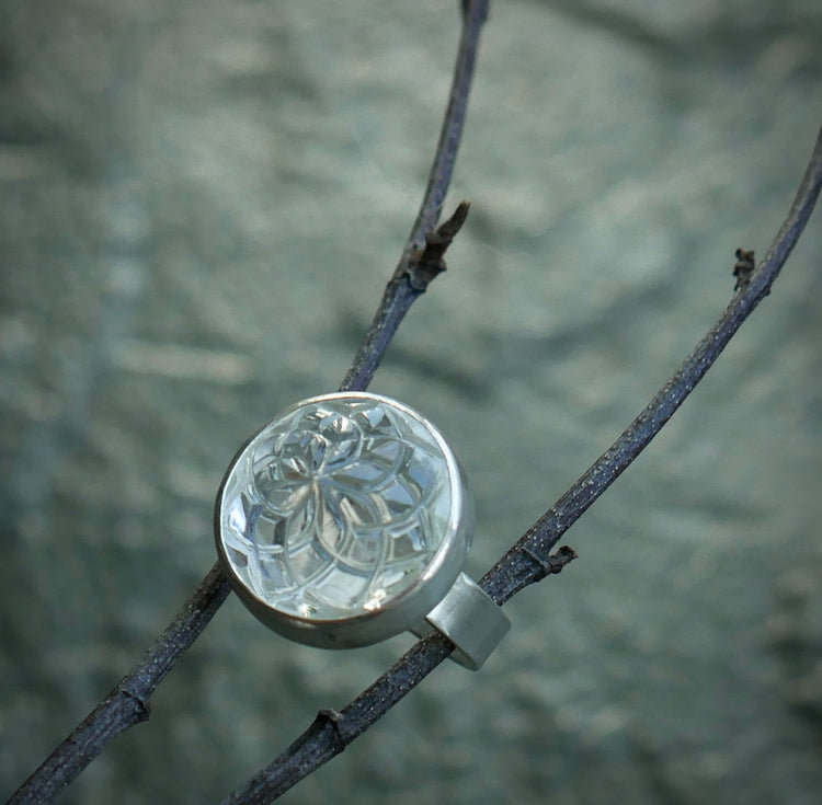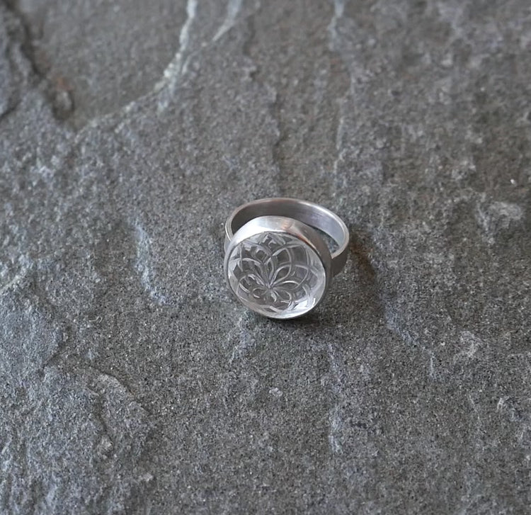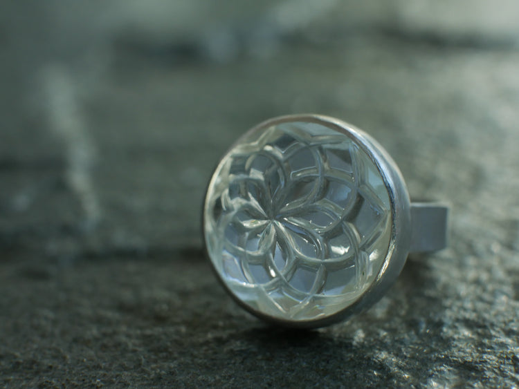 Frozen Dahlia — A Hand Carved Quartz Ring in Sterling Silver — Size 6 1/2