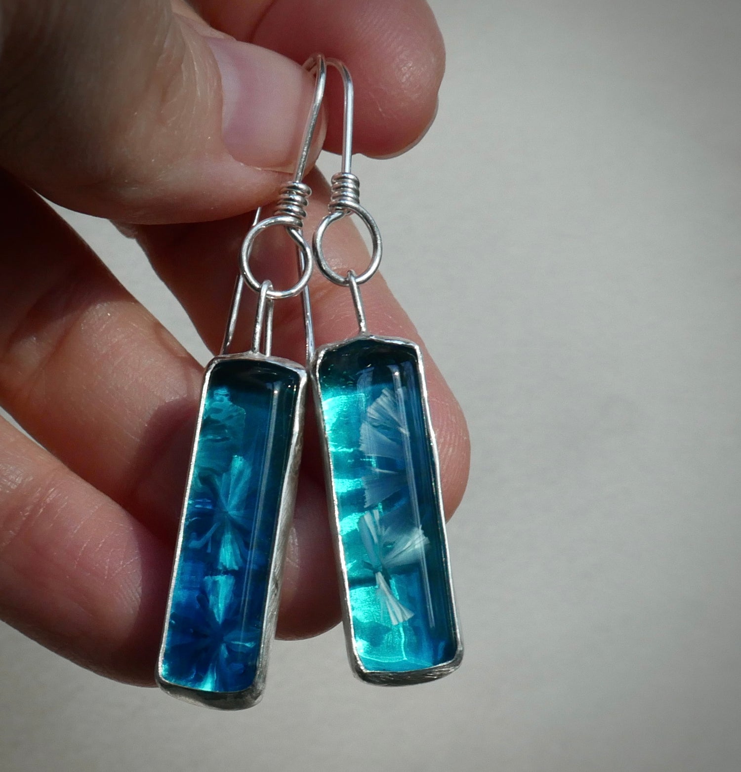 Wrapped in fine silver and set on sterling, hand formed sterling ear wires complete this pair.