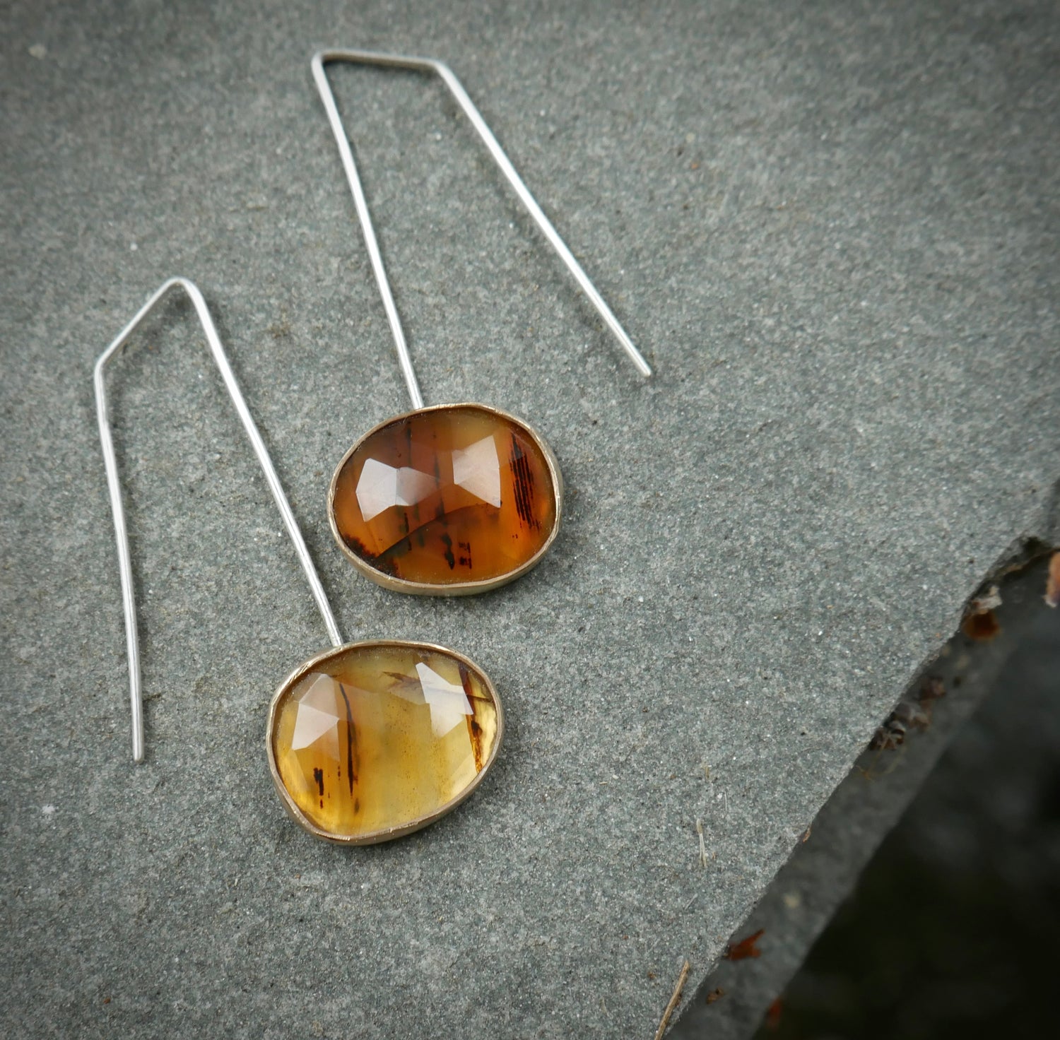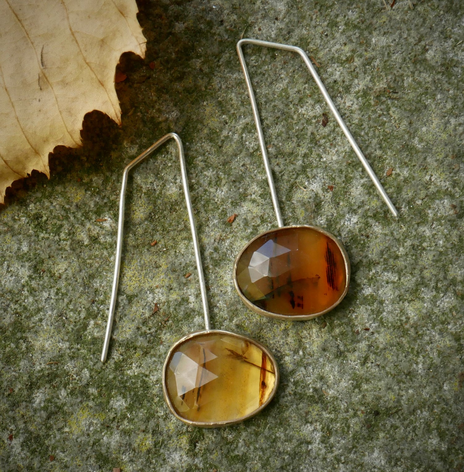Wrapped in Gold Filled Bezel and set on Sterling, hanging from hand formed sterling silver, these stones sit sideways so the “musical note” stones can face outward on your ear.