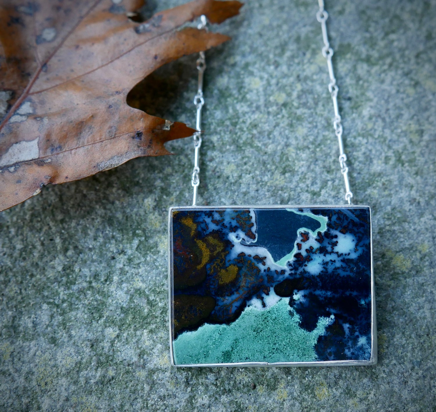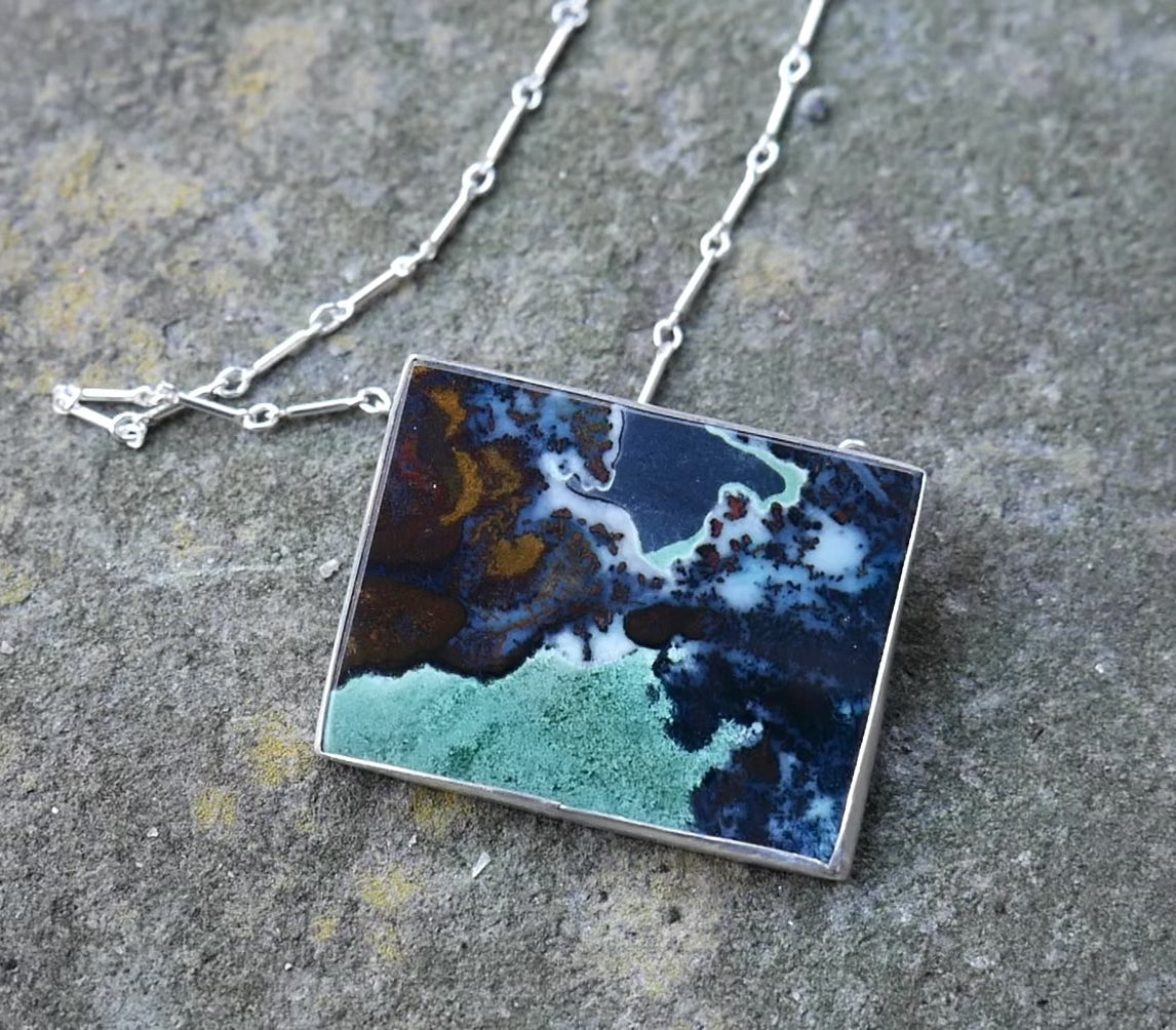 Wrapped in Fine Silver and set on Sterling Silver. As if a Landscape Masterpiece, this piece has a bail on the backside, as to not draw the eye away from the stunning view.