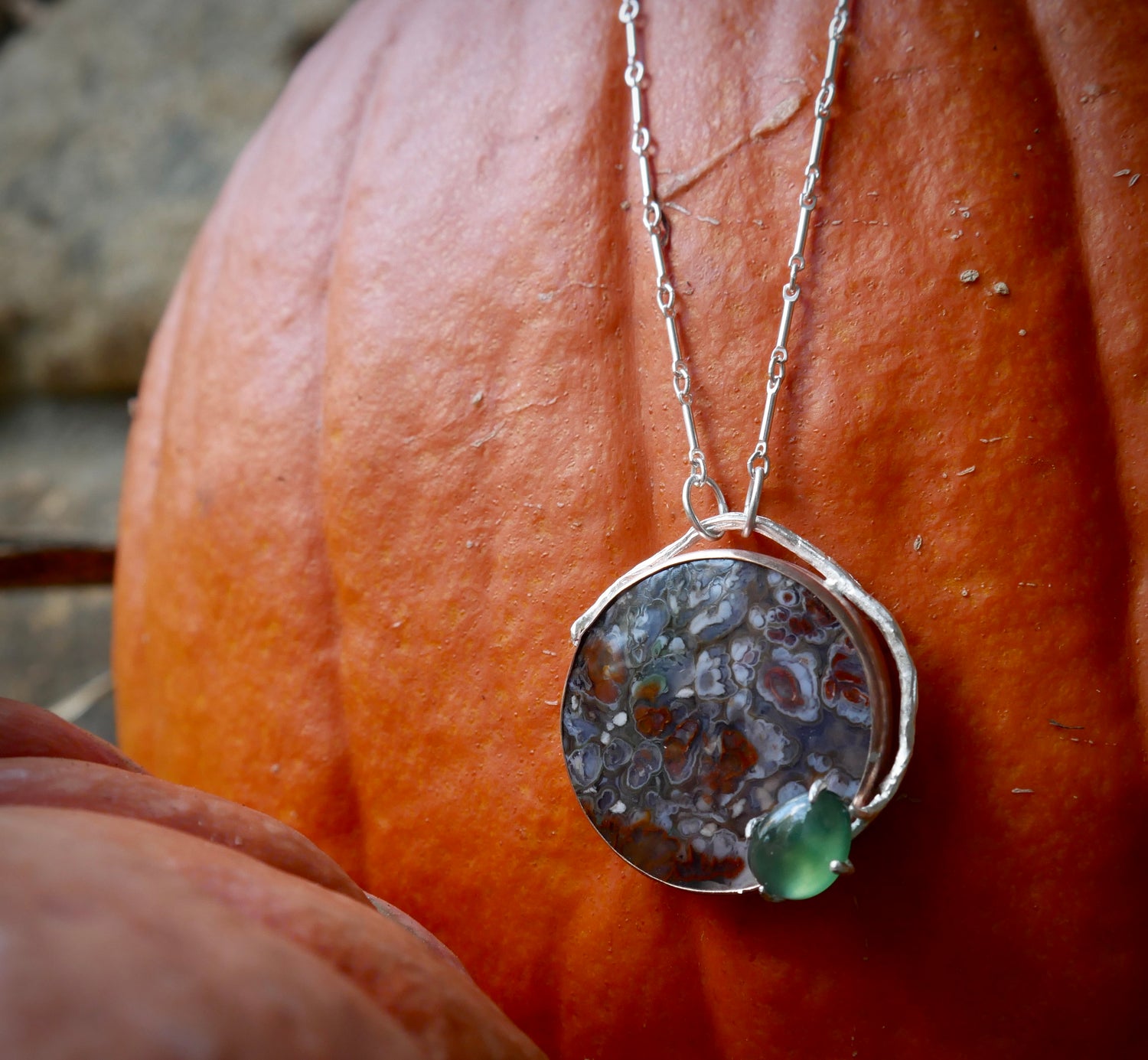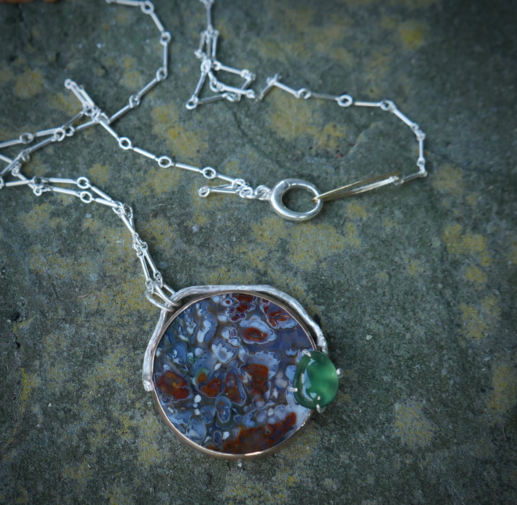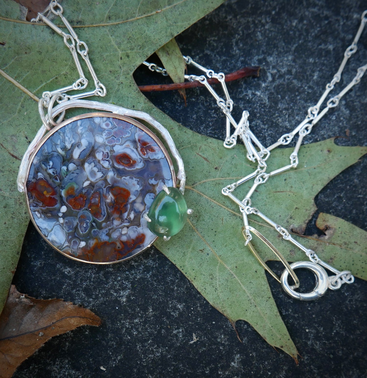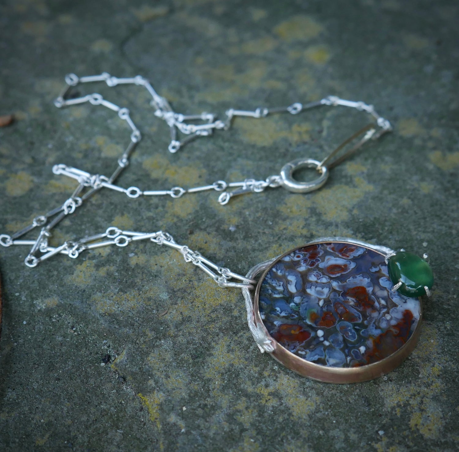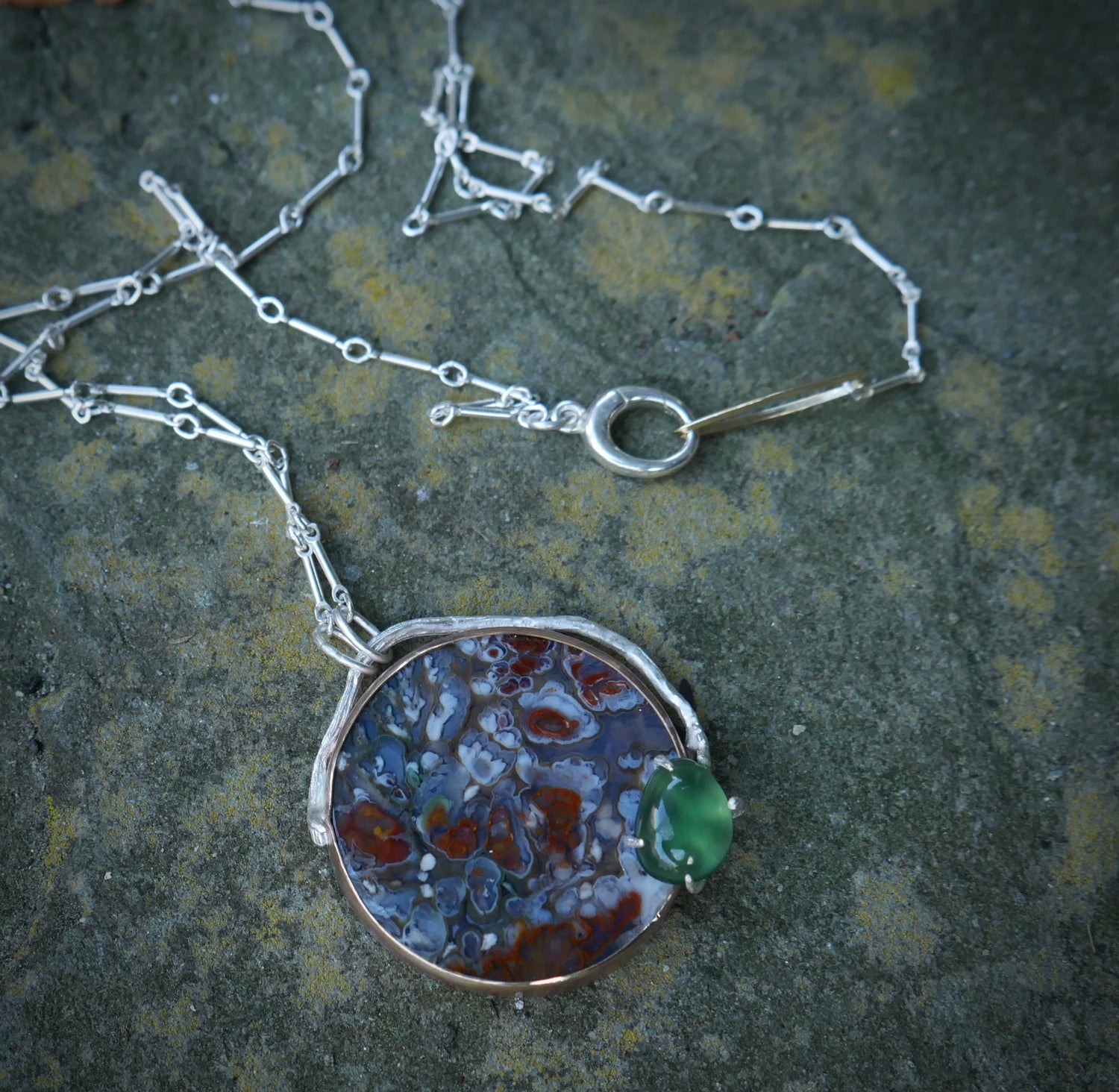Secret Garden — A Plume Petrified Wood and Serpentine Necklace in Sterling Silver and Brass