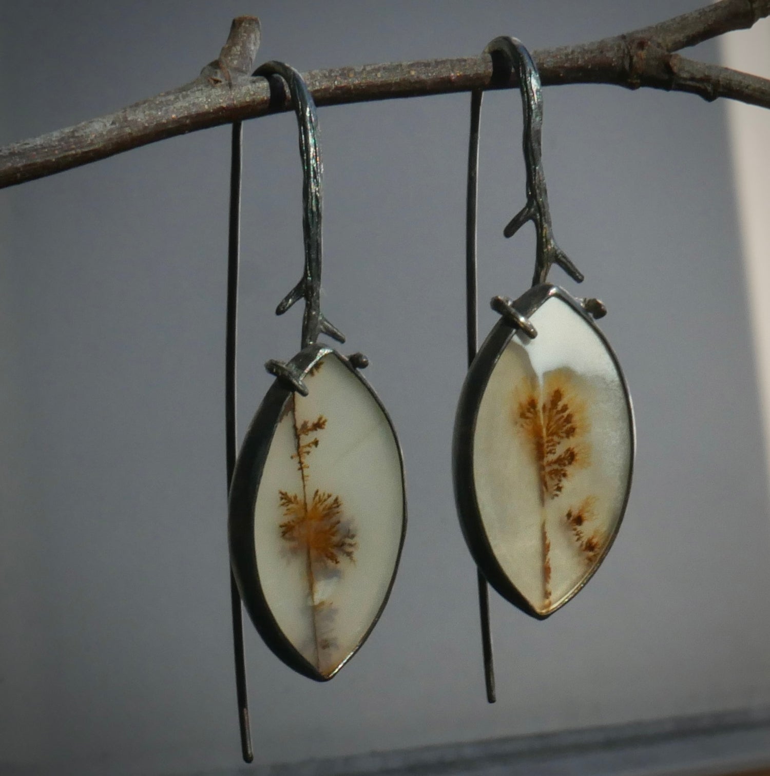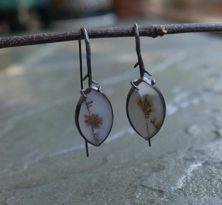 Snow Melt — A Pair of Dendritic Agate Drop Earrings in Oxidized Silver